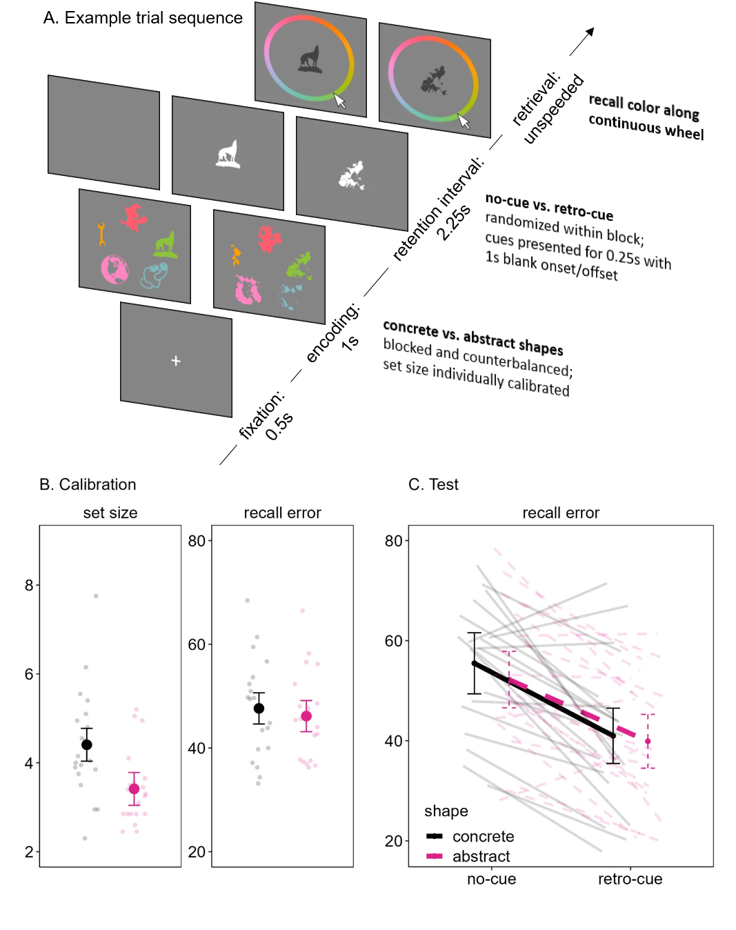 We are often in situations where we need to keep different goals active in mind to complete a task, such as having a chat with a friend: We have to focus on what our friend is saying, but also shift an arising thought to the “back of your mind” until it’s your turn to talk. How often have you had the experience of trying to refocus on what you just had in mind a moment ago, but now seems (perhaps temporarily) lost? This shifting of information in and out of one’s focus of attention, better known as refreshing (see Camos et al., 2018 for review), is a mechanism that is often asserted to be crucial to WM functioning. Research from our lab using variants of the retro-cue paradigm shown in the figure coheres with the notion that guiding attention to information that is no longer perceptually present enhances WM performance (Goldenhaus-Manning et al., 2024), but it is probably not the same thing as simply moving your eyes to where the information used to be (Loaiza & Souza, 2022). Moreover, younger and healthy older adults are just as likely to benefit from focusing or switching their attention to to-be-tested memory items (Loaiza & Souza, 2018), but healthy older adults disproportionately struggle to retain those benefits after being distracted (Loaiza & Souza, 2019). There is still a great deal of work to be done to understand exactly how this is all accomplished. For example, where does that “lost” information go — is it completely inactive in long-term memory or is there some “in-between” state? (Chao et al., 2023). And what exactly is attention doing to augment the information in WM, and how are those effects distinguishable from other mechanisms like simply repeating the information in our head over and over (i.e., rehearsal; Loaiza & McCabe, 2013)? These and other questions are fruitful avenues of research in our lab!